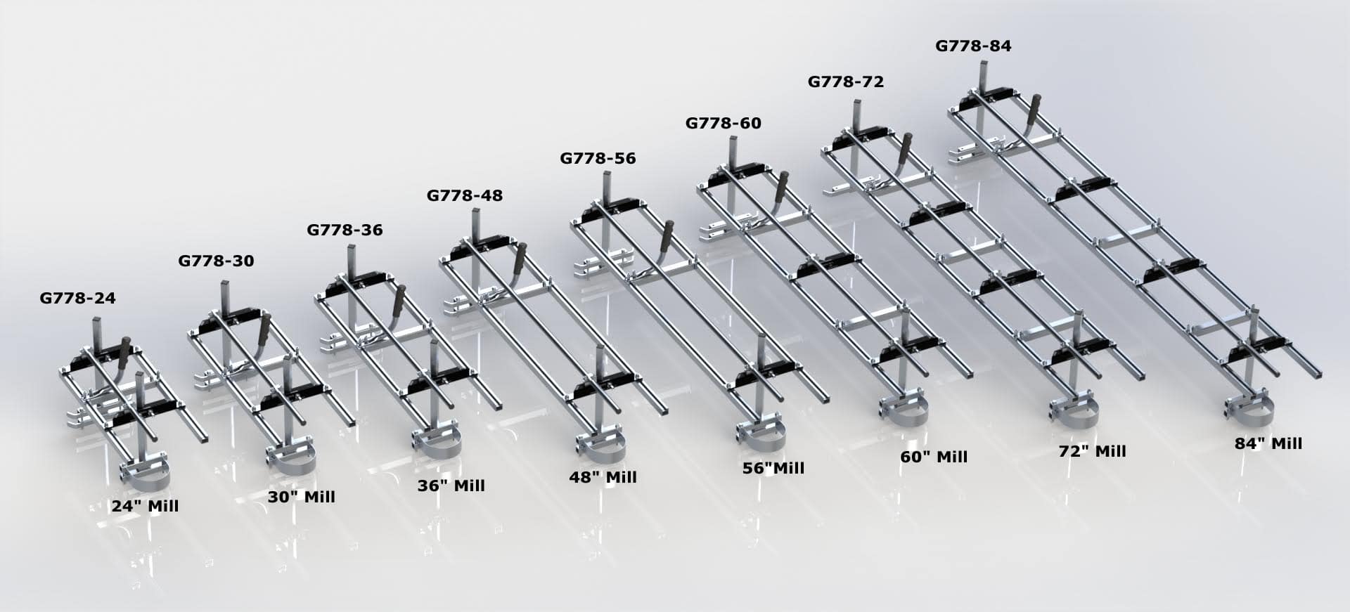 - 60″[152cm] Granberg Mk IV - Takes max bar size of 64″[162cm] to give a max cut width of 56″[142cm]