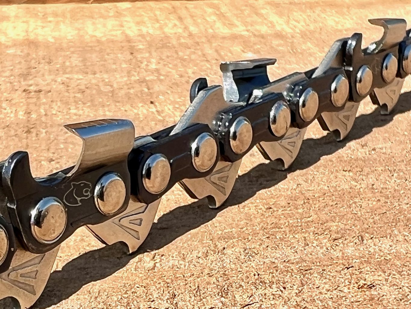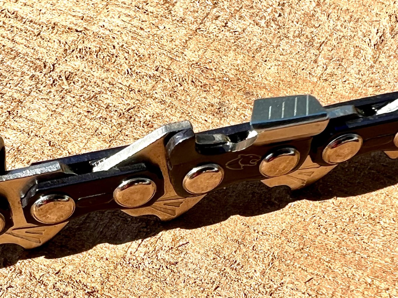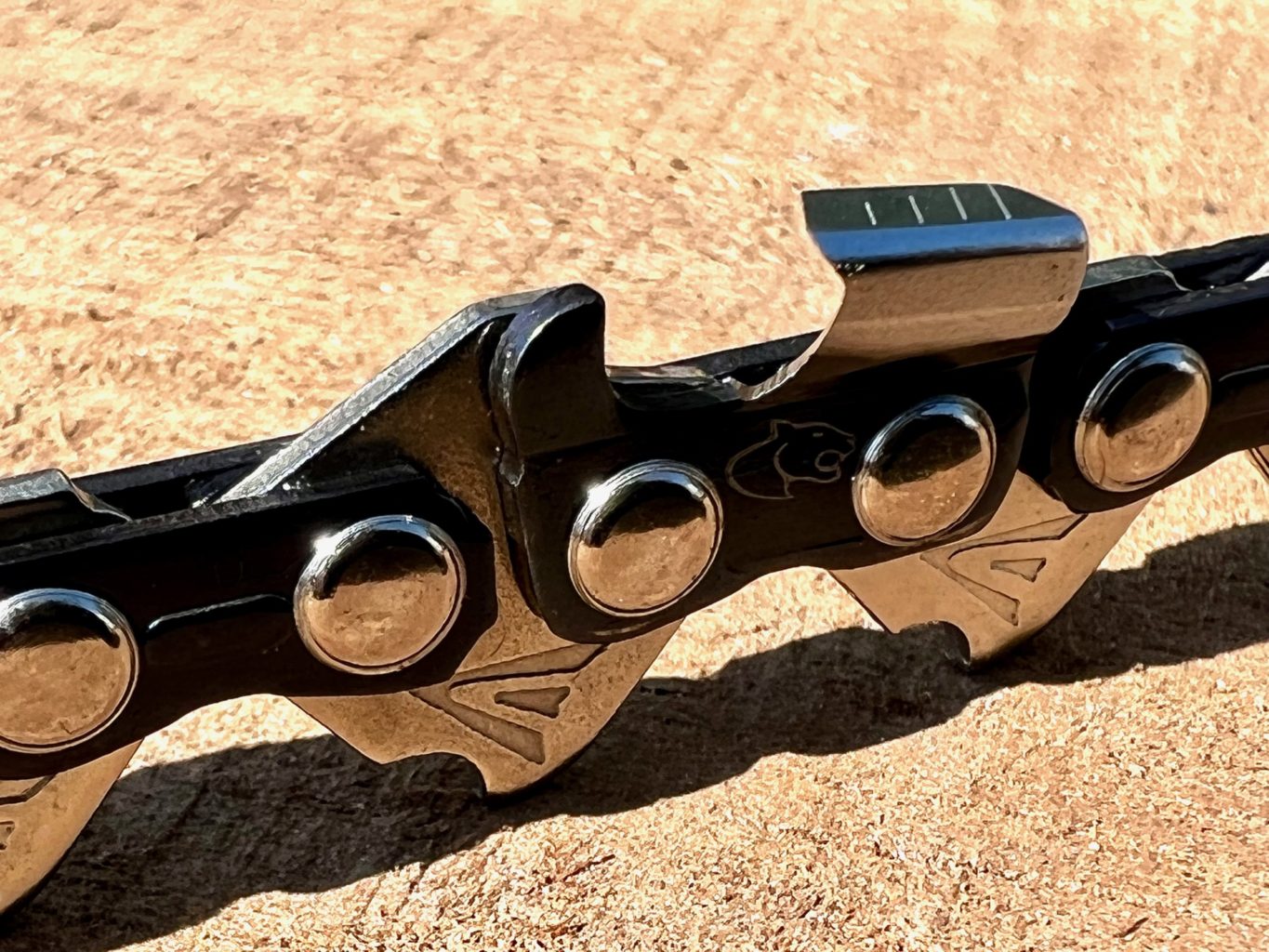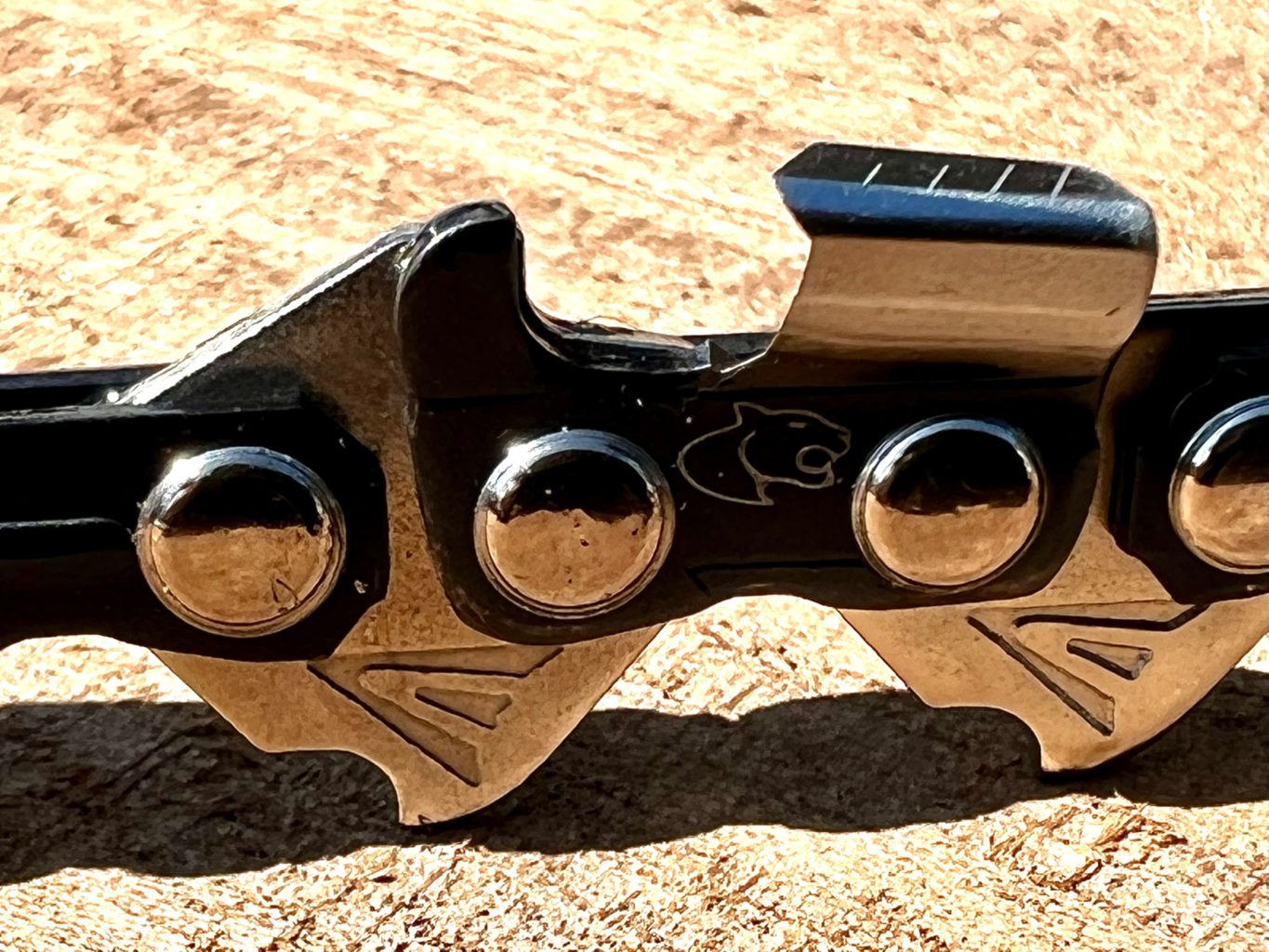 New Panther + chain [patent pending]. The + stands for additional line markings on the top plate of the tooth which helps give a visual guide to the angle you are sharpening at but more importantly it helps you judge the tooth length in relation to the other teeth on the chain. One of the hardest things to do with a chainsaw chain [without a guide] is to ensure each tooth is the same length and the same angle as all it’s brothers. If not cutting becomes inconsistent, vibration increases, the teeth that are longer take big bites of the wood and dull faster.